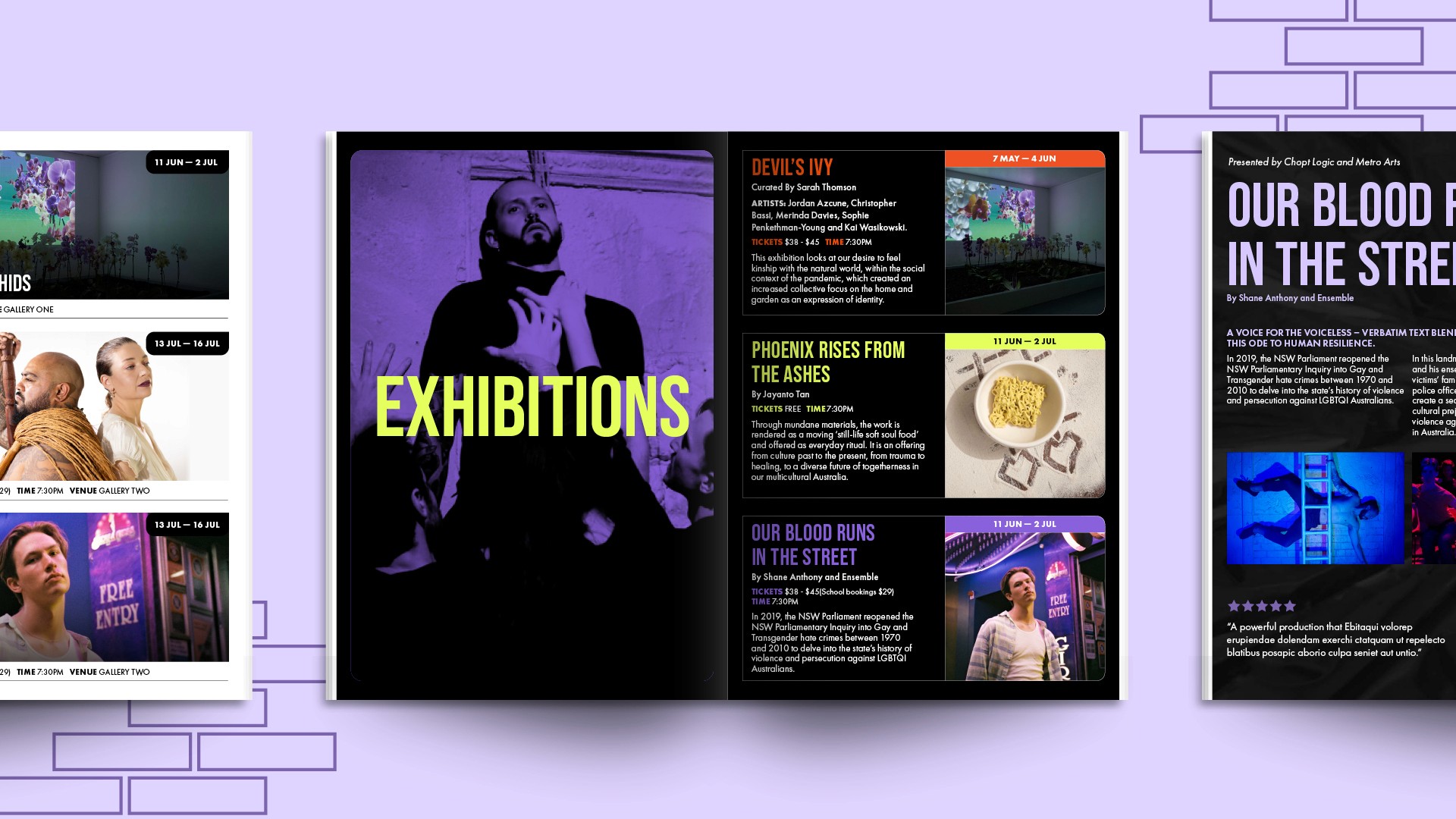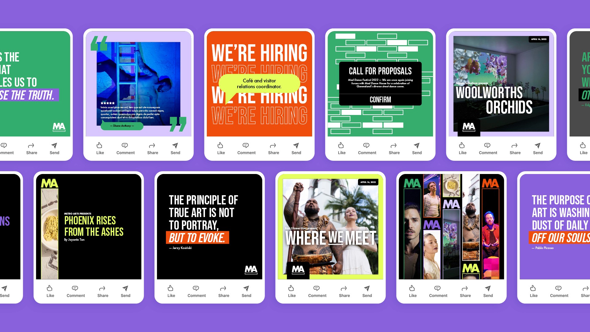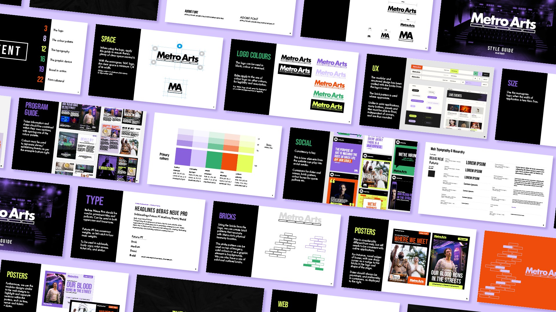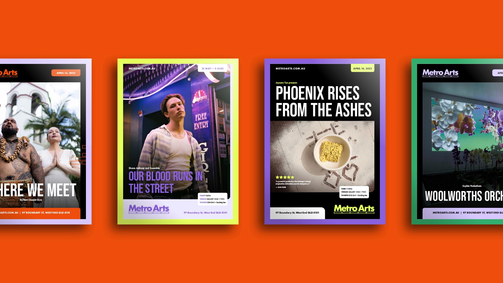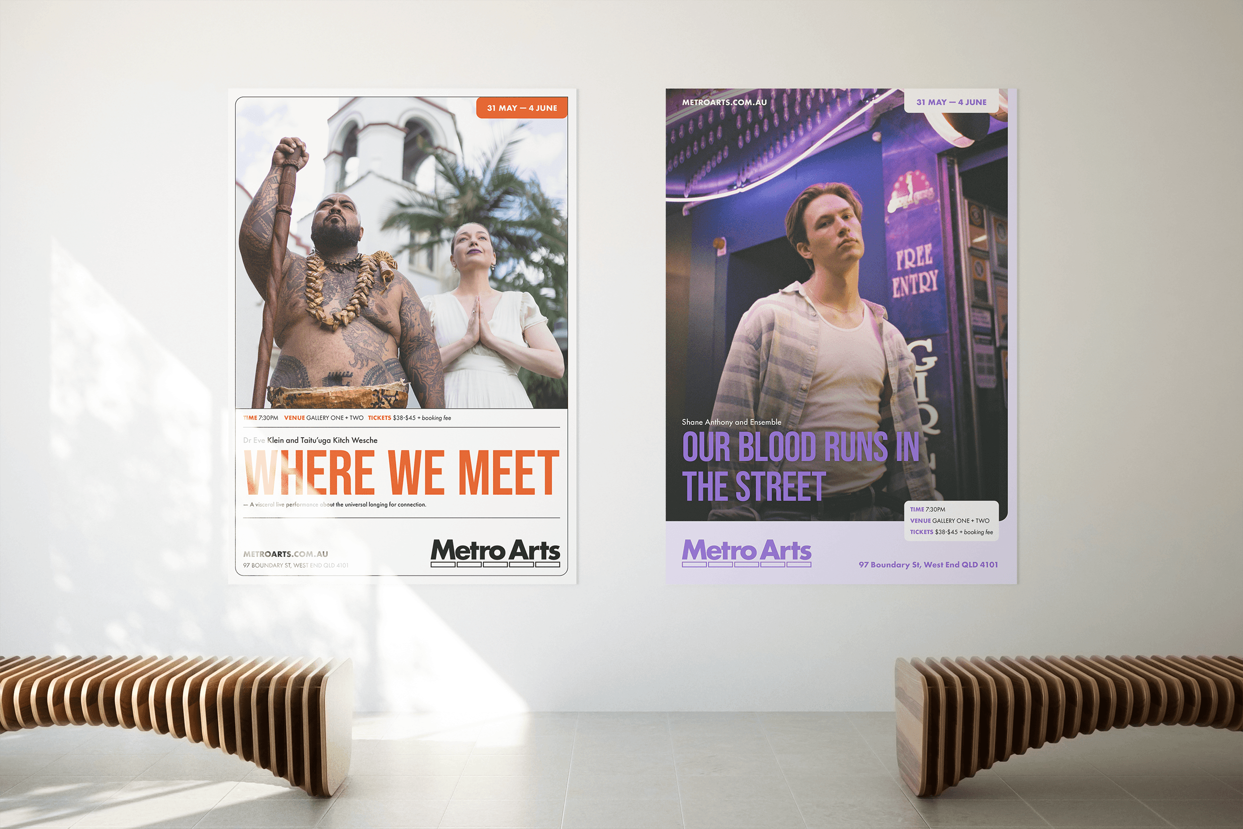 Metro Arts is a cornerstone of Brisbane’s cultural landscape, providing a home for exhilarating art and performance. We modernised their identity through a strategic lens, focusing on a visual hierarchy that champions the artist.Drawing inspiration from the venue’s laneway setting, we created a simplified logo and a rhythmic brick pattern designed to frame and support creative content. This bold, adaptive system ensures the Metro Arts brand remains a confident but subtle backdrop to the local talent it represents, resulting in a cohesive identity across brochures, social media, and environmental signage.